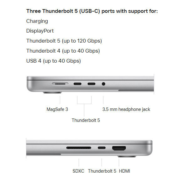 تعداد پورت USB Type-C: سه عدد (از نوع USB 4.0/Thunderbolt 5/Thunderbolt 4 با پشتیبانی از شارژ و DisplayPort)