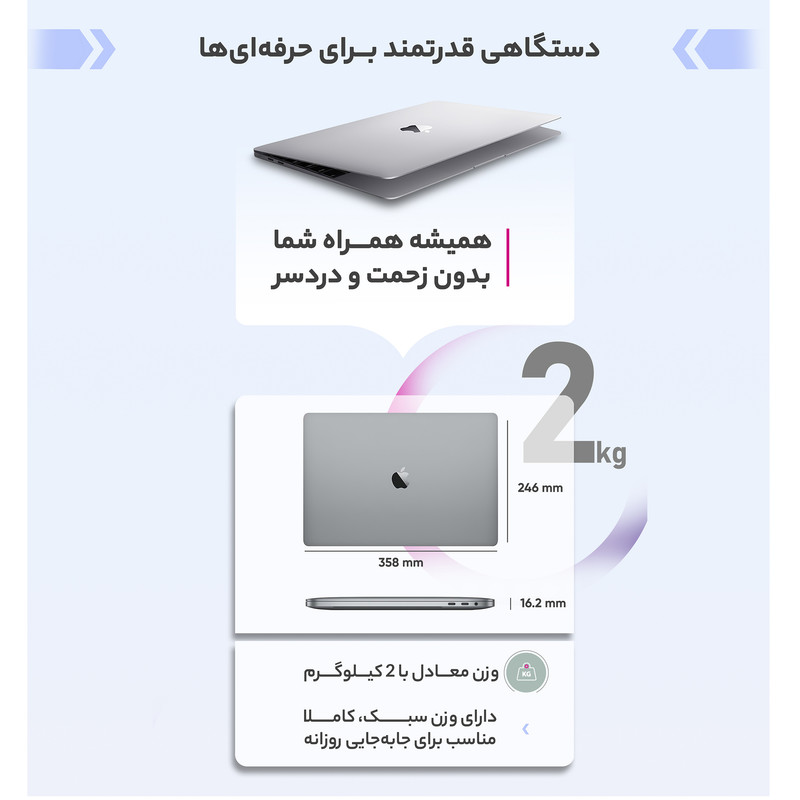 توضیحات سیستم عاملCatalinaکاربریباریک و سبک , کاربری مالتیمدیا , عمومیقابلیتهای دستگاهکیبورد با نور پس زمینهاقلام همراهآداپتور برق USB-C کابل USB-C دو متری شارژر ACسیستم عاملApple Mac OS