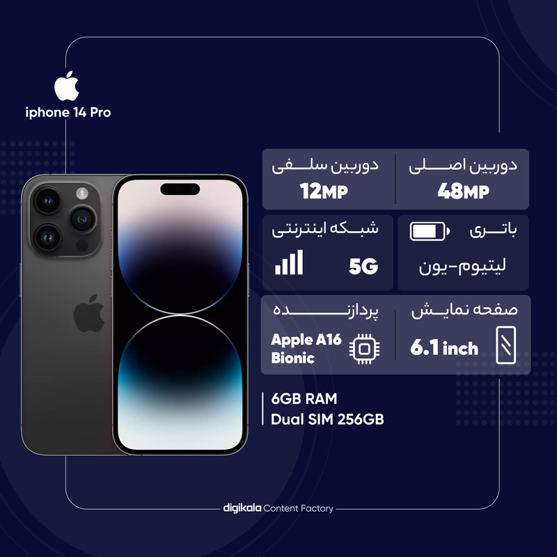iphone 14 Pro به عنوان یکی از جدیدترین گوشیهای هوشمند پرچمدار این شرکت بصورت رسمی معرفی شد و این بار با مشخصات قدرتمند وارد میدان رقابت شده است. اصلیترین تفاوت در نظر گرفته شده برای این گوشی هوشمند به نسبت نسب قبلی، بدون شک طراحی متفاوت ناچ صفحهنمایش است که این بار قابلیتهای بسیار جذابی را در اختیارتان قرار میدهد. ناچی که اعلانهای مختلف را به شما نشان میدهد وکاربرد بسیار بالایی دارد. در نمای روبهرویی این گوشی به صفحهنمایش با ابعاد 6.1 اینچ و رزولوشن 1179×2556 پیکسل از نوع LTPO Super Retina XDR OLED مجهز شده است. صفحهنمایشی که از جمله قابلیتهای قدرتمند آن، میتوانیم به نمایش 460 پیکسل در هر اینچ، حداکثر روشنایی 2000 نیت (شمع در متر مربع) و حداکثر نرخ بروزرسانی 120 هرتز، اشاره کنیم. تفاوت بعدی در قسمت سنسورهای دوربین در نظر گرفته شده است. در قسمت پشتی، یک سنسور دوربین اصلی با رزولوشن 48 مگاپیکسل از نوع عریض (wide) در کنار سنسور 12 مگاپیکسل از نوع تلهفوتو با قابلیت زوم 3 برابری اپتیکال (زوم بدون کم شدن کیفیت) و سنسور 12 مگاپیکسل از نوع فوق عریض (ultrawide) با زاویه دید 120 درجه، سنسورهای دوربین سهگانه قسمت پشتی این گوشی هوشمند را تشکیل میدهند. لازم به ذکر است که سنسور دوربین اصلی و تلهفوتو این گوشی به قابلیت جذاب و بسیار کاربردی OIS یا همان لرزشگیر اپتیکال هم مجهز شدهاند. برای دوربین سلفی هم سنسور با رزولوشن 12 مگاپیکسل در نظر گرفته شده است. در مورد سنسور دوربین اصلی و سلفی این گوشی باید بگوییم که این بار توانایی ضبط ویدیو با حداکثر کیفیت 4K در حالت سینماتیک را دارند. این در حالی است که نسل قبلی، توانایی ضبط ویدیو با نهایت کیفیت 1080p را در این بخش داشت. پردازنده جدید و قدرتمند Apple A16 Bionic هم نشان از آن دارد که میتوانید با خیال راحت با این گوشی سنگینترین بازیهای روز دنیا اجرا کنید و از عملکرد بسیار خوب آن لذت ببرید.