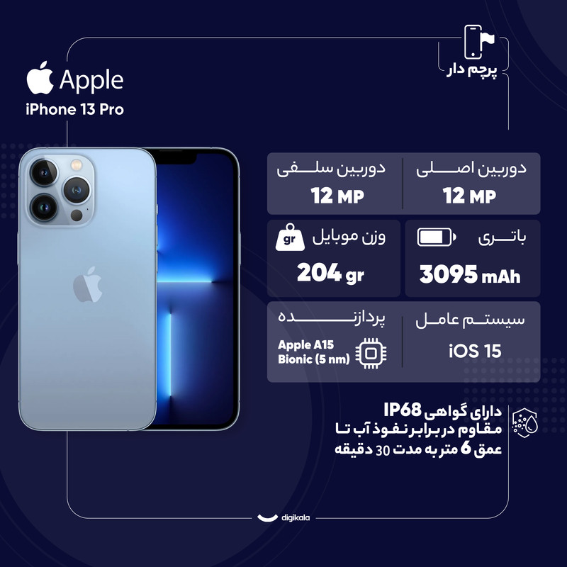 اپل همواره توانسته است گوشیهای هوشمند قدرتمند و بسیار باکیفیتی را روانه بازار کند و پرچمداران سری 13 هم توانستند با بهره بردن از مشخصات فنی قدرتمند، نهتنها به نسبت نسل قبلی یعنی خانواده iPhone12، بلکه به نسبت پرچمداران مدعی دیگر هم عملکرد بسیار درخشانی داشته باشند. iPhone 13 Pro از لحاظ مشخصات فنی در نظر گرفته شده چیزی کم از گل سرسبد این سری یعنی iPhone 13 Pro Max ندارد. در نمای روبهرویی این گوشی به صفحهنمایش با ابعاد 6.1 اینچ و رزولوشن 2532x1170 از نوع Super Retina XDR OLED مجهز شده است. صفحهنمایش بسیار باکیفیت که از جمله قابلیتهای قدرتمند آن، میتوانیم به نرخ بروزرسانی 120 هرتز و البته حداکثر روشنایی 1200 نیت (nits) اشاره کنیم. در بخش سنسورهای دوربین هم قرارگیری سه سنسور با رزولوشن 12 مگاپیکسل به ترتیب از نوع عریض، تلهفوتو و فوق عریض یا همان ultrawide هستیم که البته سنسور TOF 3D LiDAR هم با عملکردی مشابه با سنسورهای سنجش عمق و البته بهتر، این گوشی را همراه میکنند. برای دوربین سلفی هم سنسور با رزولوشن 12 مگاپیکسل در نظر گرفته شده است. در بخش فیلمبرداری هم مثل همیشه این بار اما به لطف توانایی ضبط ویدیو با نهایت کیفیت 4K و سرعت 60 فریم در ثانیه برای سنسور عریض و سلفی، این گوشی عملکرد بینظیری را به شما ارائه میکند که کمتر پرچمداری توانایی رقابت با آن را دارد. حضور پردازنده قدرتمند Apple A15 هم سبب شده تا این گوشی بهراحتی از پس اجرای سنگینترین بازیهای روز دنیا بربیاید. باتری با میزان ظرفیت 3095 میلیآمپرساعت از دیگر مشخصات در نظر گرفته شده است. البته باید بدانید که خبری از آداپتور شارژر نیست. این گوشی موبایل با سری F(Not Active) توسط کمپانی اپل عرضه میشود. گوشیهای سری F به علت نقص نرمافزاری به نمایندگیهای اپل برای تعمیر تحویل داده شدهاند و بدنه این کالاها کاملا نو است و همچنین دارای گارانتی جهانی اپل هستند. گوشیهای اپل با پارت نامبر(Active) 5L به عنوان کالاهای تعمیر شده توسط کمپانی اپل (از نظر سخت افزاری یا نرمافزاری) است اما گارانتی جهانی اپل را ندارند. گوشی های اپل با پارت نامبر 5C(Active) ، کالاهایی هستند که توسط شرکتهایی غیر از کمپانی اپل تعمیر و عرضه میشوند و مورد تایید اپل نیستند.