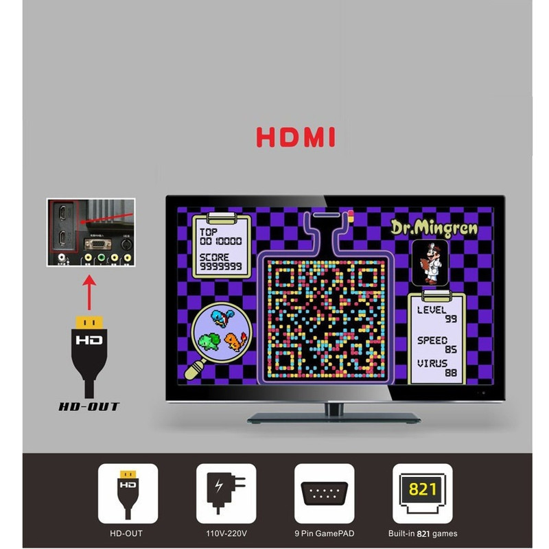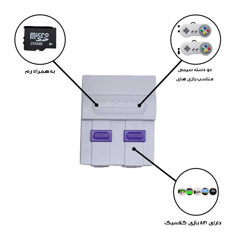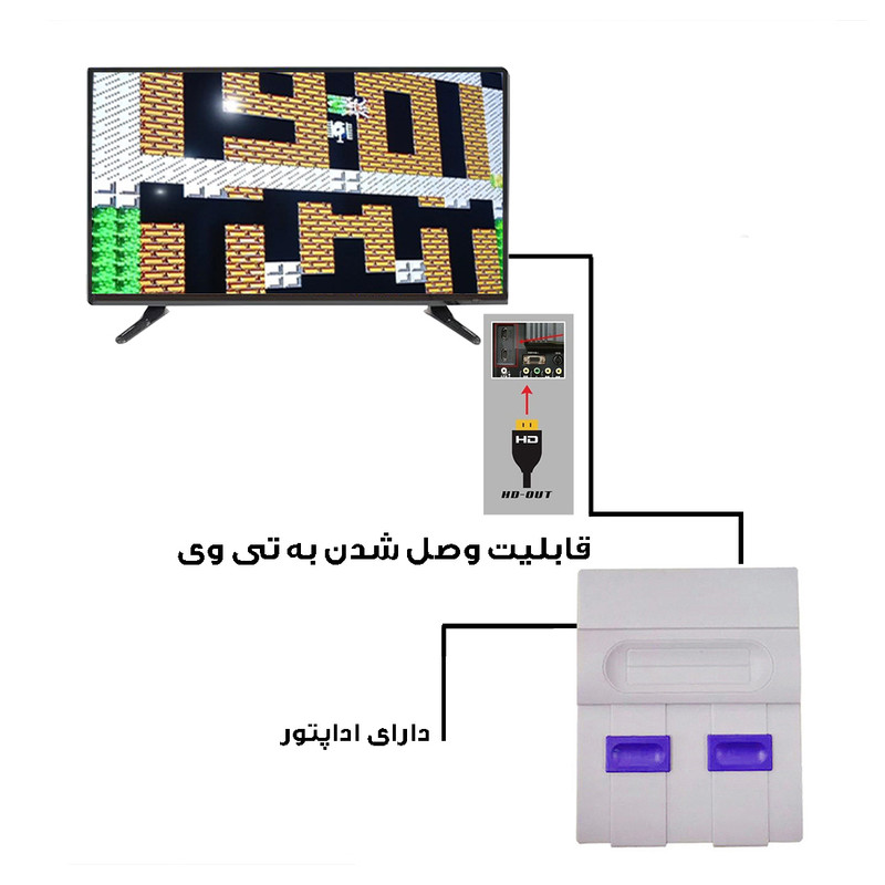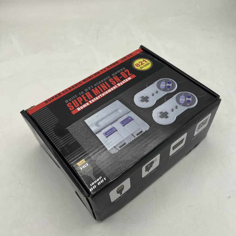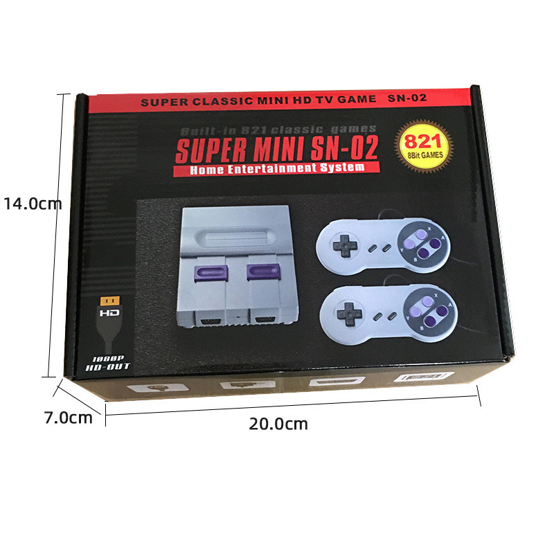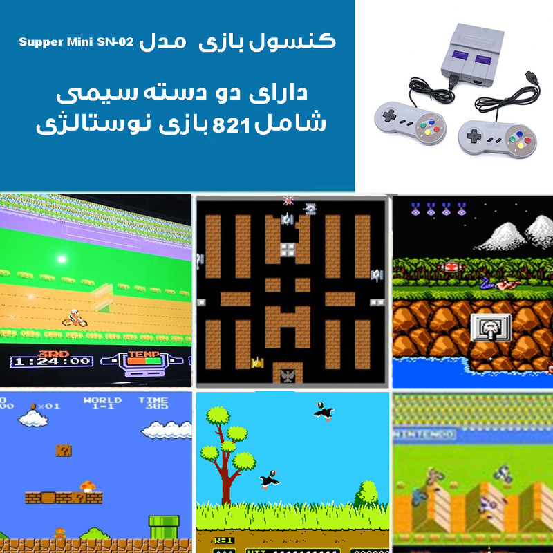 مینی کنسول میکرو مدل Supper Mini SN-02 شامل 821 بازی کلاسیک از کنسولهای میکرو، نینتندو، و... است که با کیفیت Full HD در صفحه نمایش تلویزیون اجرا می شود. این دستگاه شامل دو دسته بازی، یک آداپتور همراه با کابل برق است و توسط یک رابط HTMIبه تلویزیون های خانگی متصل میشود و شمارا به خاطرات خوش قدیم دعوت می کند. این کنسول شامل بازی های نوستالژی و خاطره انگیزی مثل قارچ خور ، بمبر من ، شورش در شهر و ... است ، همچنین همراه با دودسته یک آداپتور برق به همراه کابل و یک کابل تصویر HTMI برای شما ارسال می شود . این دستگاه از محدود کنسول های بازی کلاسیک است که کابل HTMI دارد که کیفیت تصویر بسیار بهتری نسبت به رقبا اراِه میکند