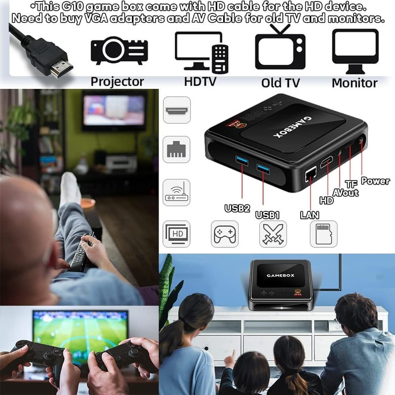 کنسول بازی GAMEBOX Plus 20000+ از بیش از 20 نوع شبیه ساز آرکید یکپارچه سازی با سیستم عامل پشتیبانی می کند تا به دوران شاد کودکی بازگردید. 64G داخلی 40000 بازی کلاسیک، زمان خسته کننده شما را از بین می برد.